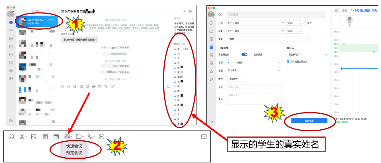 以上课堂准备完成后,即可在企业微信中班级群发送通知,开展直播和开展会议。