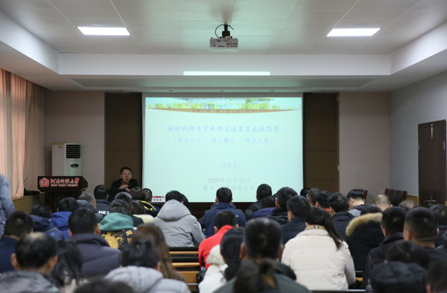 12月25日下午,天津体育学院博士生导师闫育东教授在体育学院一楼会议室为学院师生作了一场题为“新时代体育学术研究成果生成链思考”的学术报告。体育学院院长岳贤锋、青年教师代表及研究生120余人参加了本次学术报告。报告由体育学院副院长孟国正主持。