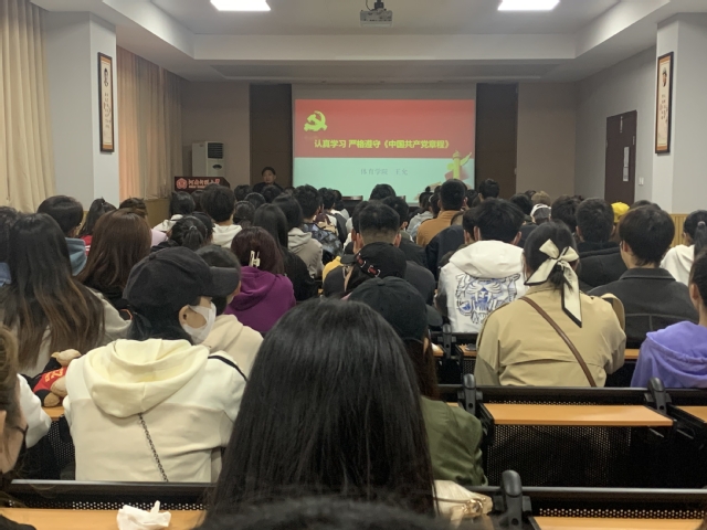 为推进“学党史、悟思想、办实事、开新局”走深走实,4月10日下午,体育学院党委书记王允以《认真学习 严格遵守中国共产党章程》为题作党史学习教育宣讲报告。体育学院学生党员、入党积极分子共计120余人参加了学习。