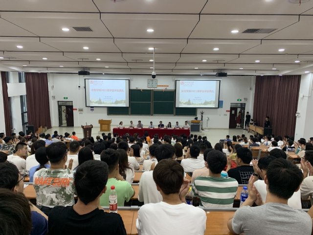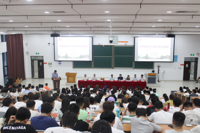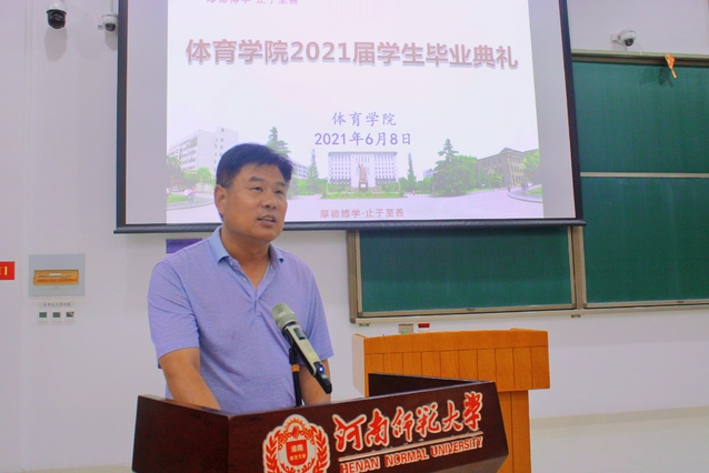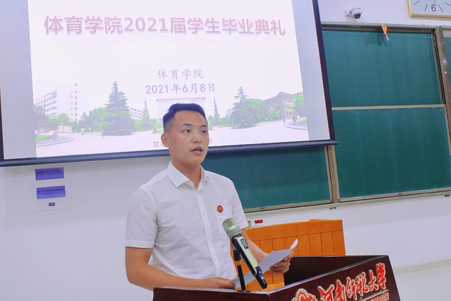 典礼在庄严的国歌声中拉开序幕。院长岳贤锋首先致辞。他代表体育学院全体师生向2021届毕业生表示衷心的祝贺。忆往昔,峥嵘岁月稠。看今朝,时代勇担当。望未来,责任千钧重。临别之际,他为毕业生送上三个锦囊:“青春有一万种可能,别怕‘多折腾’”“青春有一千种选择,别怕‘走弯路’”“青春有一百种成功,别怕‘跑龙套’”,勉励大家在未来的人生旅程中,不负青春、不负韶华,以燃烧的青春点亮奋斗的人生,用青春的力量擎起时代的梦想。