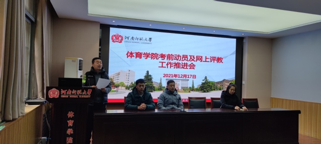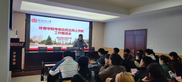 12月17日,体育学院在一楼大会议室召开考前动员及网上评教工作推进会,体育学院副院长李玉周、团委副书记刘广宣、全体专兼职辅导员及学生代表参加会议。
