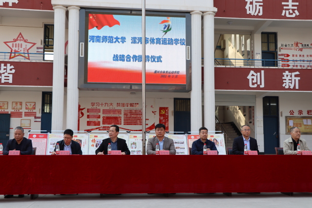 3月13日下午,“beat365官方网站优质体育生源基地”“beat365官方网站体教融合实践基地”授牌仪式在河南省漯河市体育运动学校举行。体育学院院长岳贤锋、副院长李玉周、漯河市人民政府办公室副主任王江涛,漯河市教育局党组成员、副局长刘盘松,漯河市体育局党组成员、副局长李庆瑜、麻玉田,漯河市体育运动学校校长王永伟出席授牌仪式,漯河市体育运动学校党支部书记王广华主持授牌仪式。