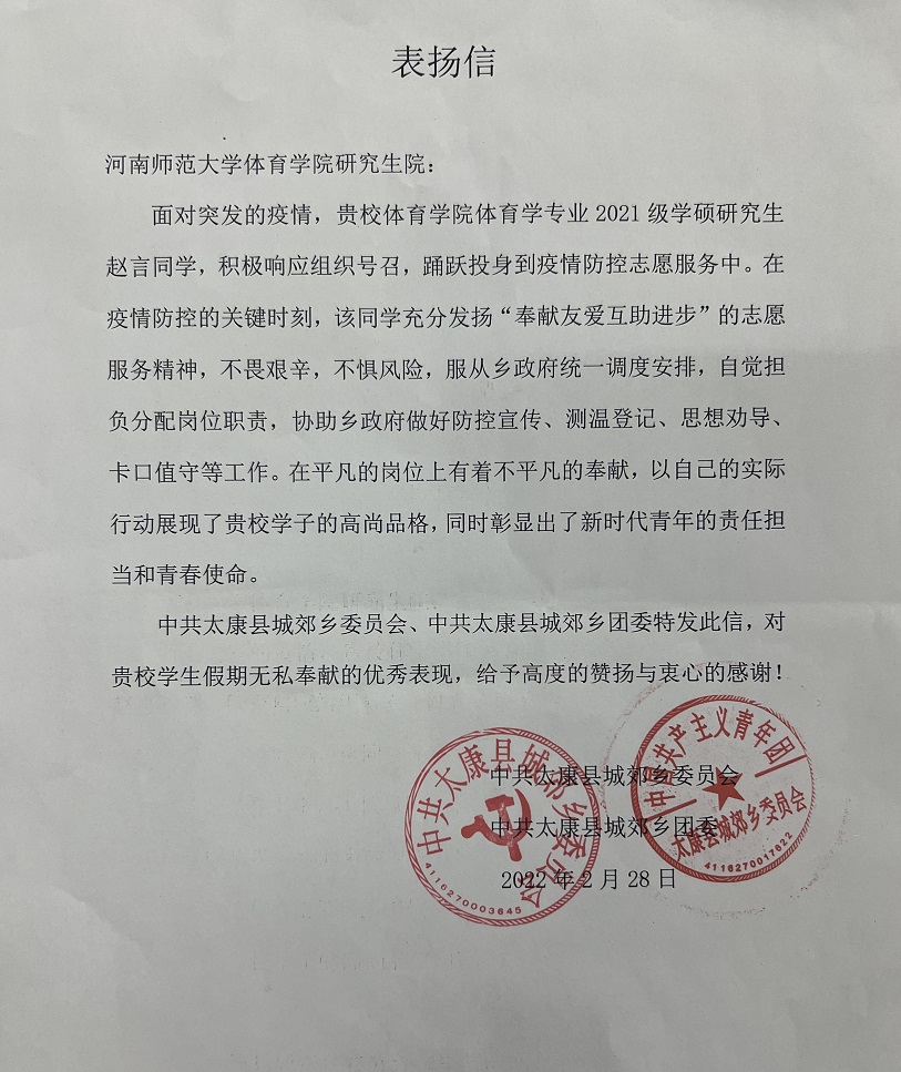 4月22日,beat365官网收到太康县城郊乡委员会的表扬信,对beat365官网体育学院体育学专业2021级研究生赵言同学假期疫情期间的志愿服务工作给予了高度赞扬与衷心感谢。